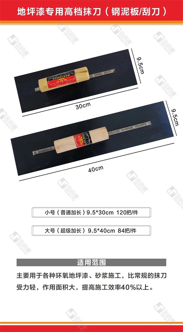 金師傅油漆噴涂保護膜全面上市 采用靜電技術(shù),塑料原膜,吸附能力強,韌性好,承重力強 地坪漆專用抹刀(鋼泥板)也已到貨 地坪漆大刮刀能提高施工效率40%以上 金師傅JSF噴涂保護膜 地坪漆專用高檔抹刀(鋼泥板/刮刀)