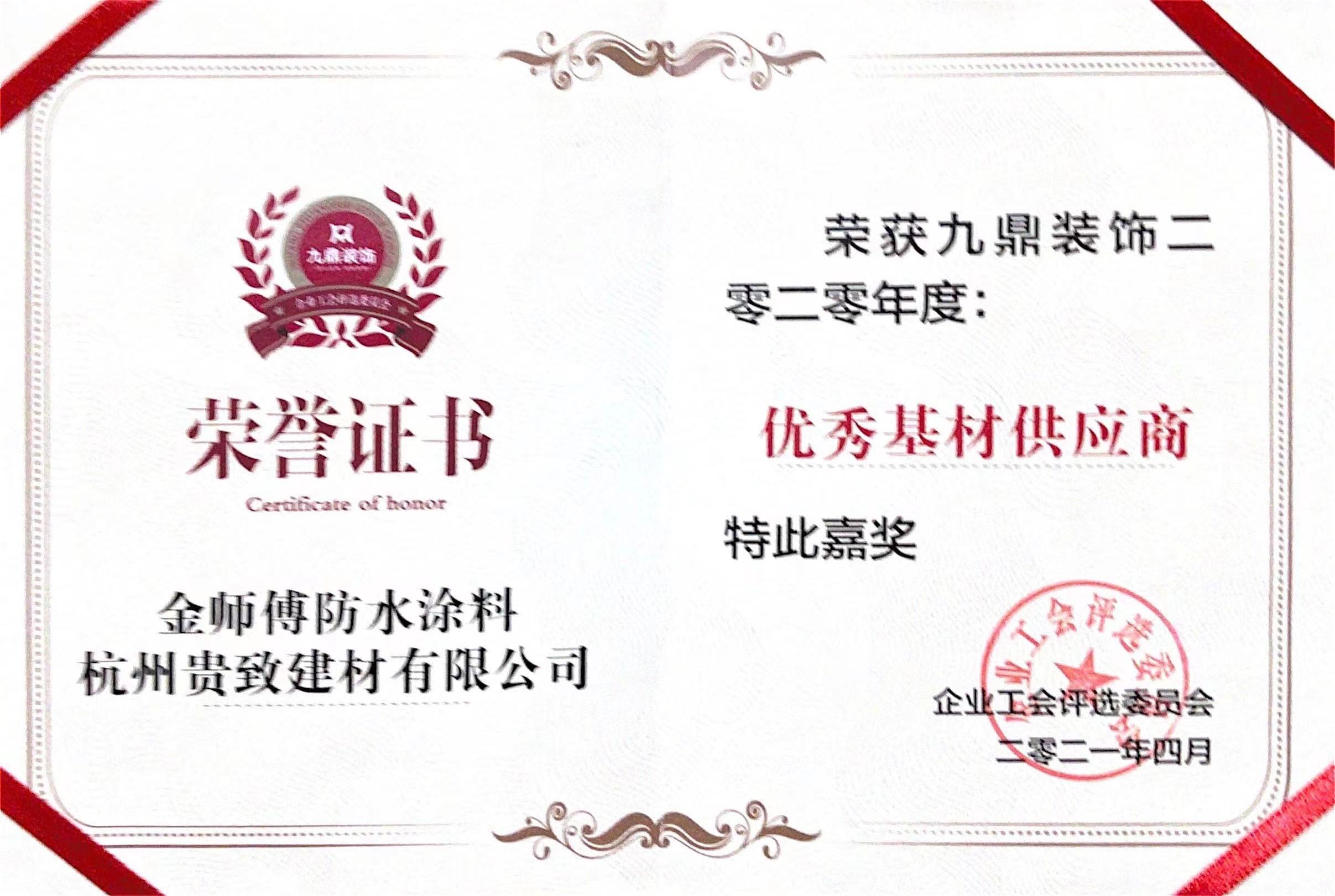 2021年4月9日,九鼎建筑裝飾工程有限公司2020年度表彰大會在杭州蕭山劇院舉行,對各個崗位、各個領域涌現(xiàn)出來的先進單位和個人進行隆重表彰。 喜訊傳來——作為與九鼎裝飾合作多年的金師傅防水涂料,憑借優(yōu)質(zhì)的配套服...