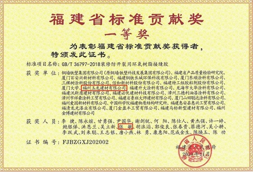 恭賀福州玉龍建材有限公司榮獲標準項目名稱:裝修防開裂用環(huán)氧樹脂接縫膠(GB/T36797-2018)2020年福建省標準貢獻獎一等獎。