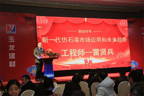 隨后,玉龍建材營(yíng)銷(xiāo)總監(jiān)章侶敏,涂料工程師雷賢兵,膠粘劑工程師王詩(shī)文一一介紹了關(guān)于金師傅品牌營(yíng)銷(xiāo)、金師傅御石漆、金師傅膠粘劑等板塊的工作與規(guī)劃。