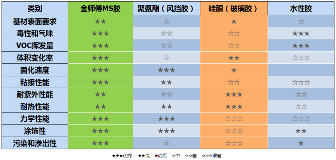 硅酮膠粘結(jié)力相對較弱,并且會隨著時間的推移減弱,聚氨酯膠粘結(jié)力強,但需要配合底涂使用,MS 密封膠具有優(yōu)異的粘結(jié)性能,能夠適應(yīng)絕大多數(shù)建筑基材,無需底涂。