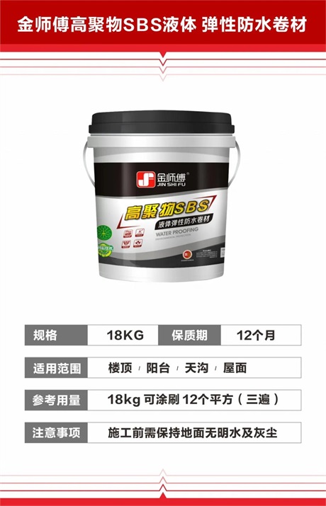 金師傅高聚物SBS液體彈性防水卷材是一款單組份、冷施工、濕氣觸發(fā)式固化液態(tài)防水卷材,固化后形成一層經(jīng)久耐用、無縫一體的防水卷材,可在潮濕基面施工且能與任何異物粘結(jié),形成穩(wěn)定、整體無縫的防水層,既可以在常溫環(huán)境施工也可在低溫環(huán)境下施工,適用于暴露式屋面、陽臺、樓頂防水。